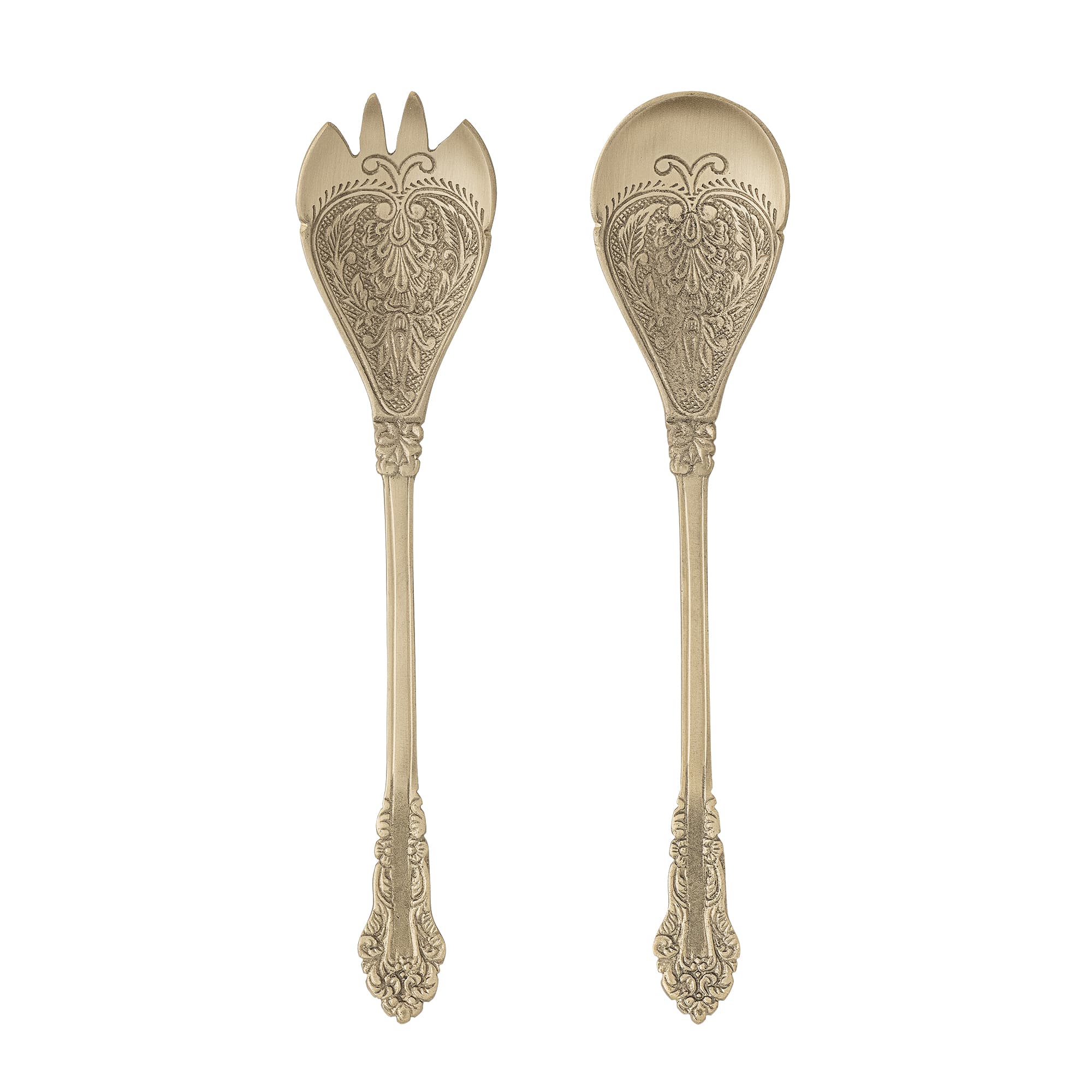 Kalima Salatsættet fra Bloomingville er et elegant og dekorativt sæt, der skiller sig ud med sin messingfinish og indgraverede design. Det detaljerede mønster på bestikket giver det et luksuriøst udtryk, som passer perfekt til både hverdag og festlige beg
